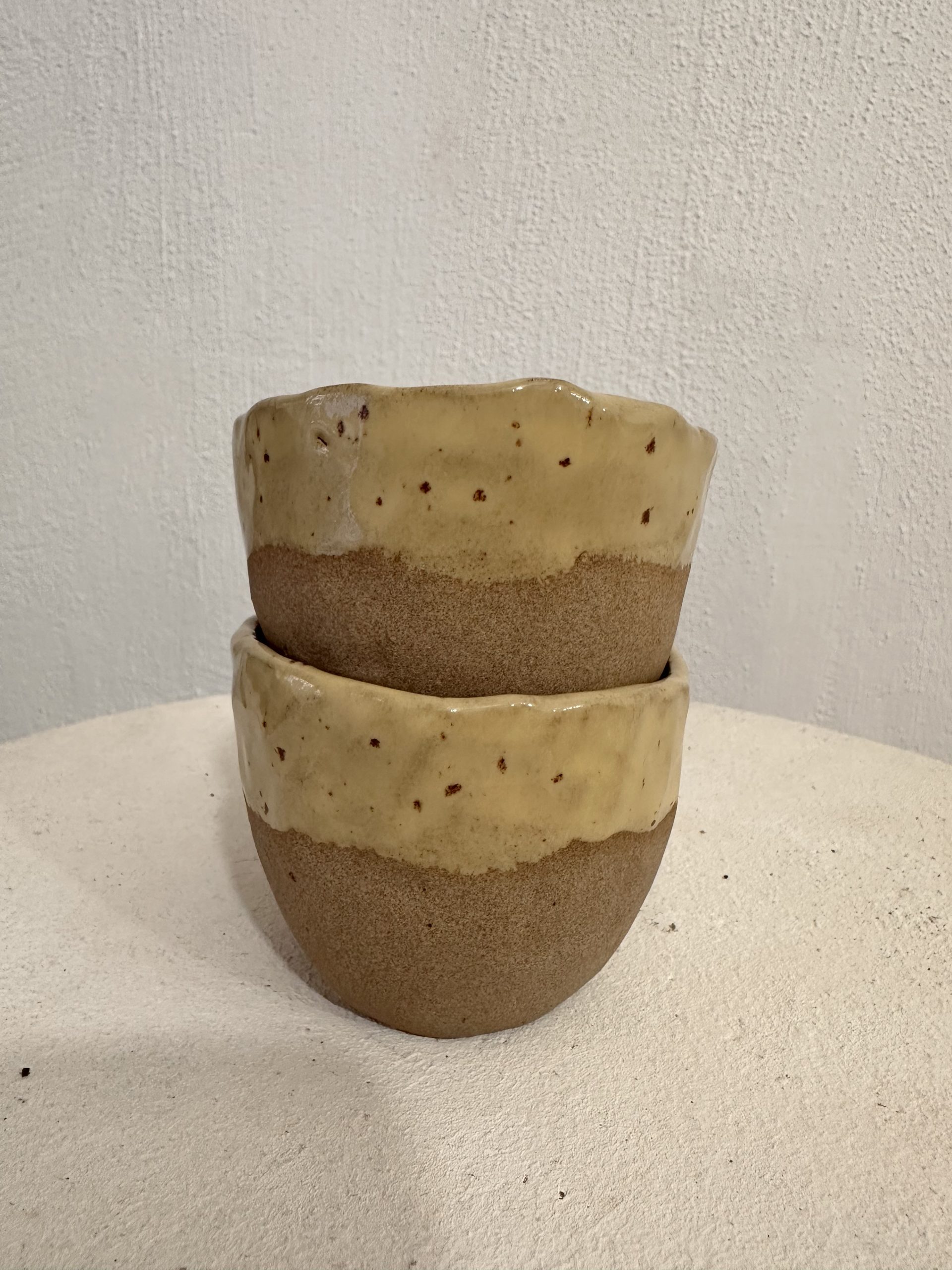 Taza tamaño Latte sin asa, barro de alta temperatura en color toffee y acabado esmaltado rosa o amarillo, tonos pastel